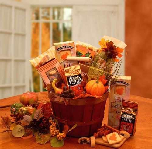 Fall themed gift basket ideas. With such a variety of choices between coffee tea chocolate hot punch etc. Fill one of these baskets with flowers pumpkins or other fall decorating ideas. To finish off the look tie a cute bow around the entire gift.