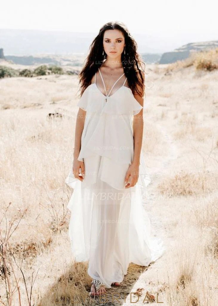 Spaghetti Strap Boho Wedding Dress. Spaghetti strap appliques chiffon wedding dress. Ivory lace+nude lining as picture;